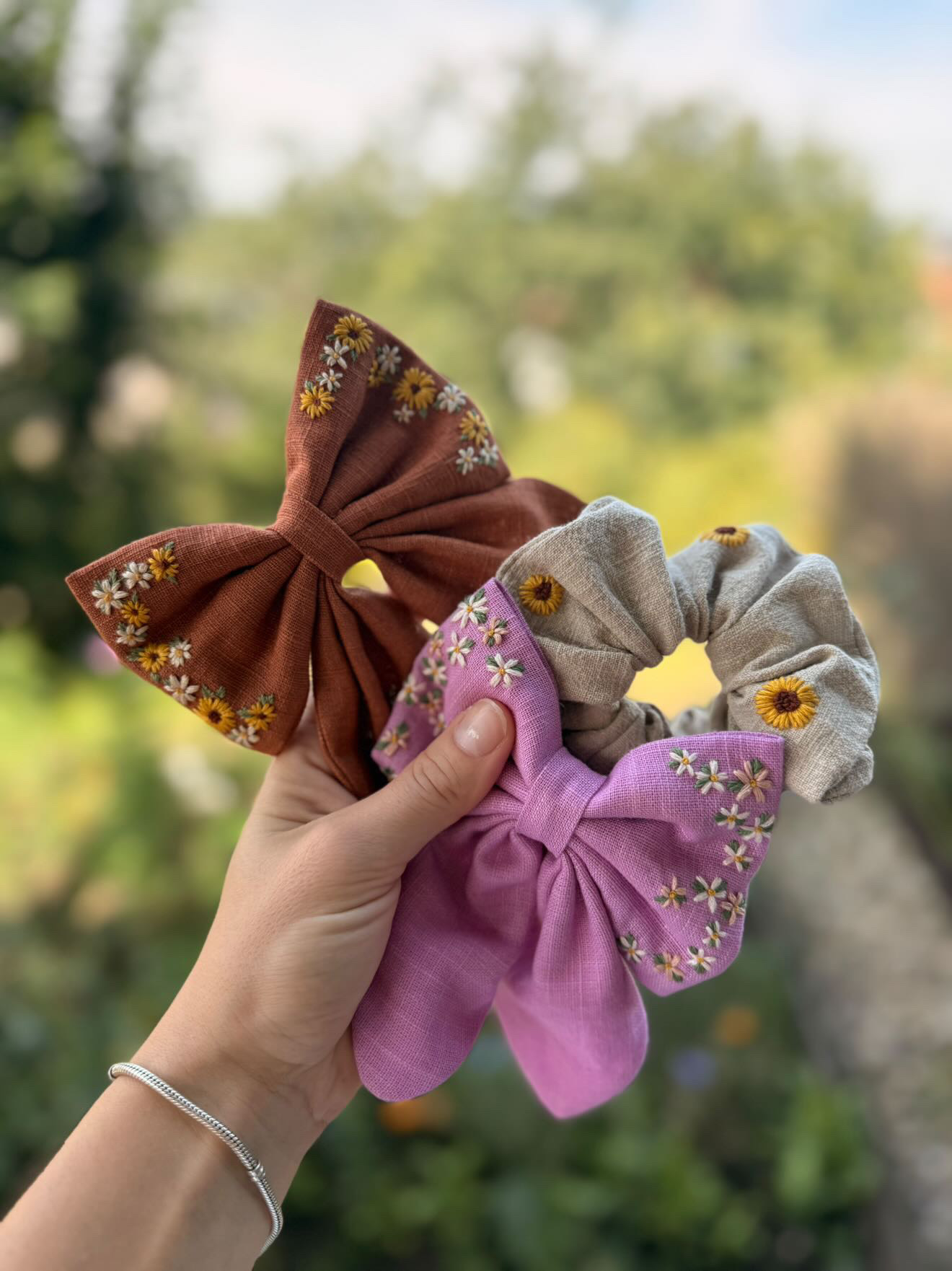 Ručně vyšívaná scrunchie spona na klipu. Jedinečný handmade doplněk, který krásně ozdobí účes.