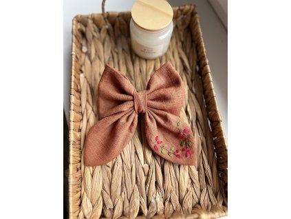 Jemná lněná mašle v teplé rezavé barvě s ruční výšivkou šípků. Přirozený a hravý doplněk do vlasů, který krásně ladí s přírodními tóny a podtrhne tvůj jedinečný styl.