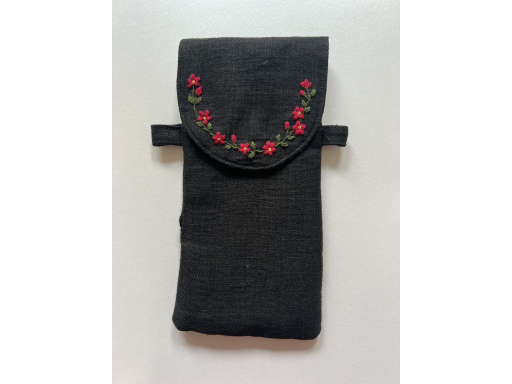 Ručně šitá kapsička o rozměrech 10 × 19 cm, zdobená jemnou květinovou výšivkou přímo na klopě. Každá výšivka je tvořena ručně, díky čemuž je každý kus jedinečný. Kapsička se hodí na mobil, doklady, kapesníčky i dětské drobnosti.