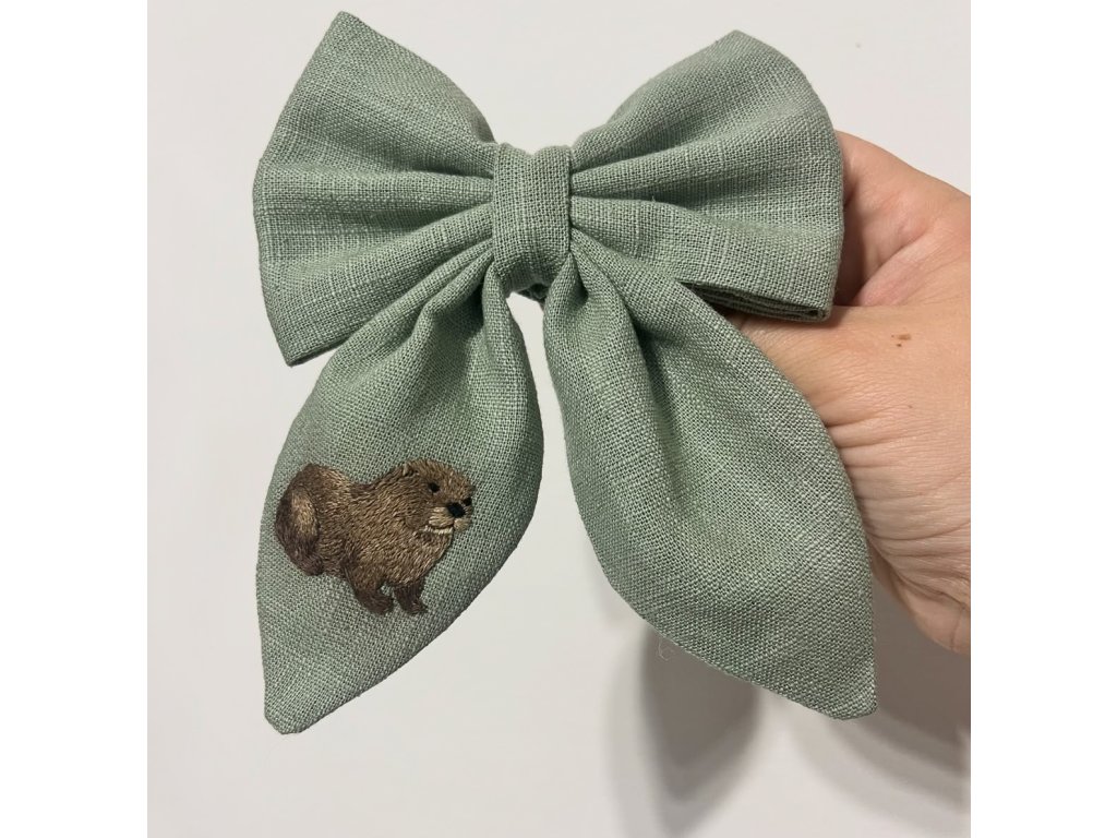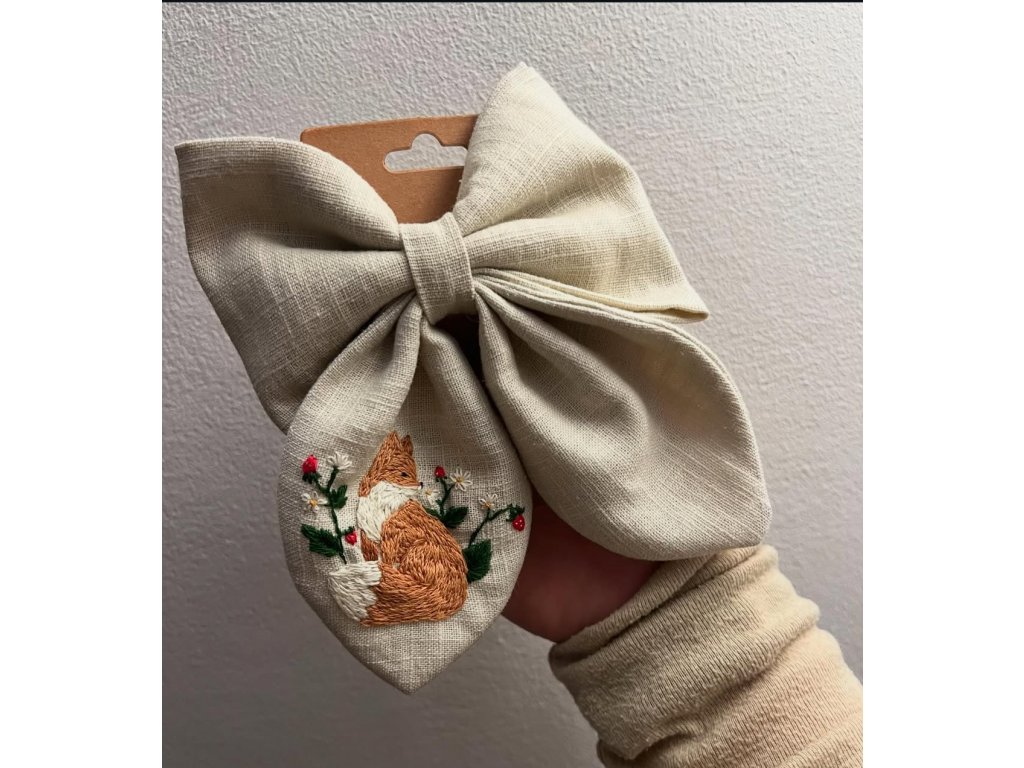 Originální ručně vyráběná mašle dle vlastního návrhu, doplněná motivem zvířátka na jednom cípu. Každý kus vzniká na zakázku s důrazem na jemnost a detail.