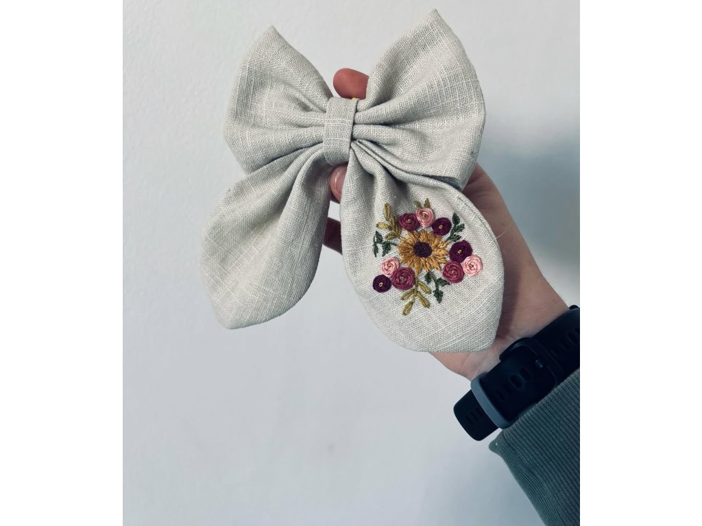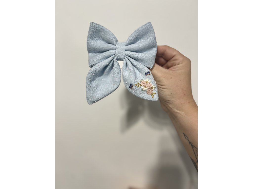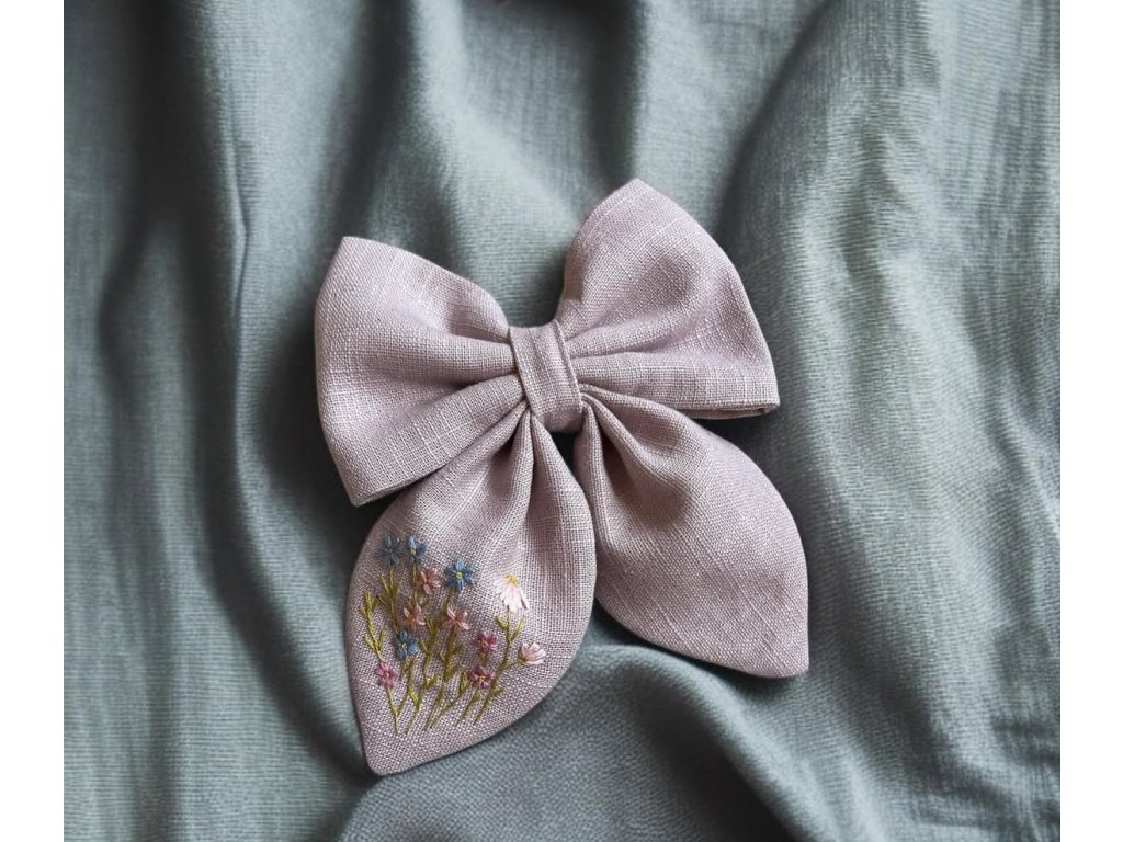 Každá mašle je pečlivě ušita a doplněna ruční květinovou výšivkou, která dává každému kousku jedinečný půvab.