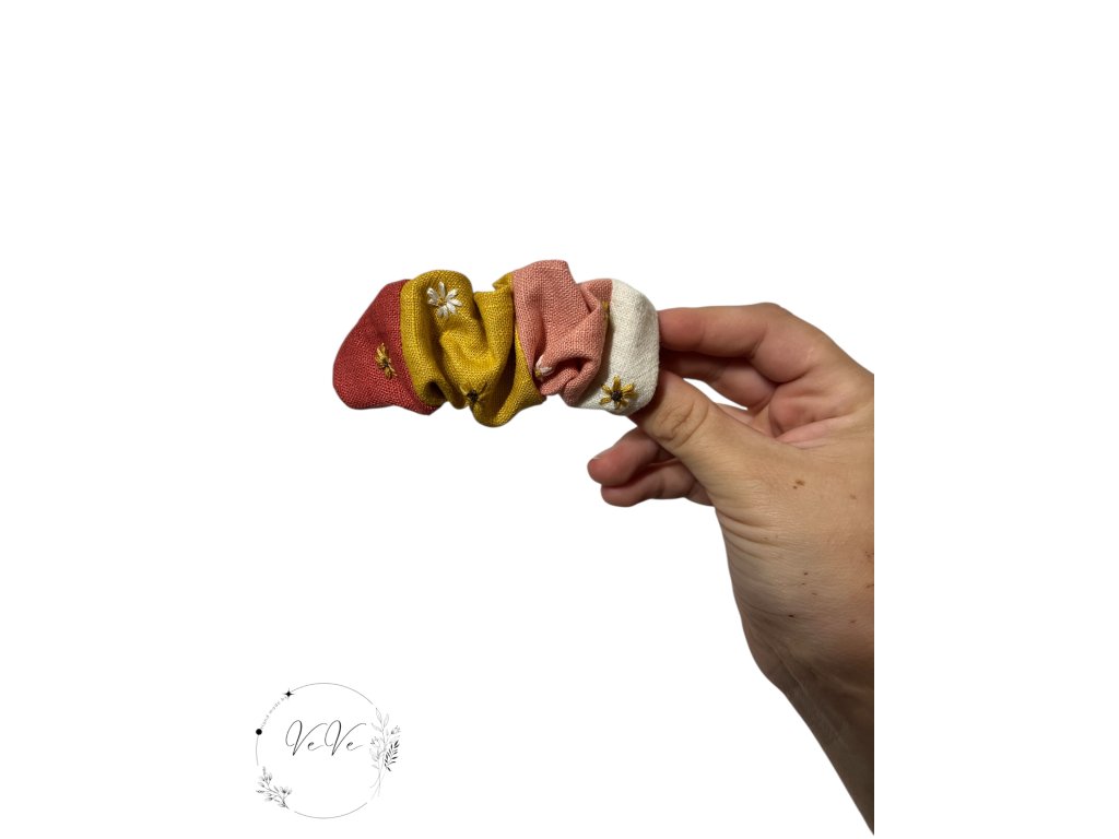 Upcyklovaná scrunchie spona ve žlutých a růžových odstínech s ručně vyšívanými kvítky. Veselý doplněk z recyklované látky, délka 10 cm.